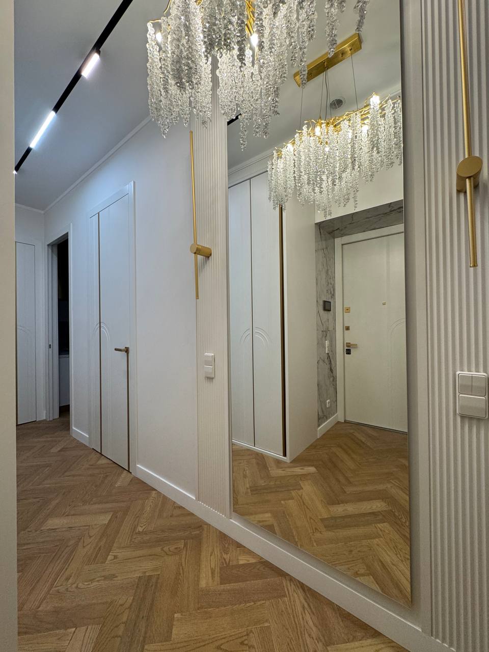 Мне нравится, что кварцпаркет даёт возможность использовать парящий плинтус — это аккуратное, лёгкое решение, которое сейчас часто применяю.