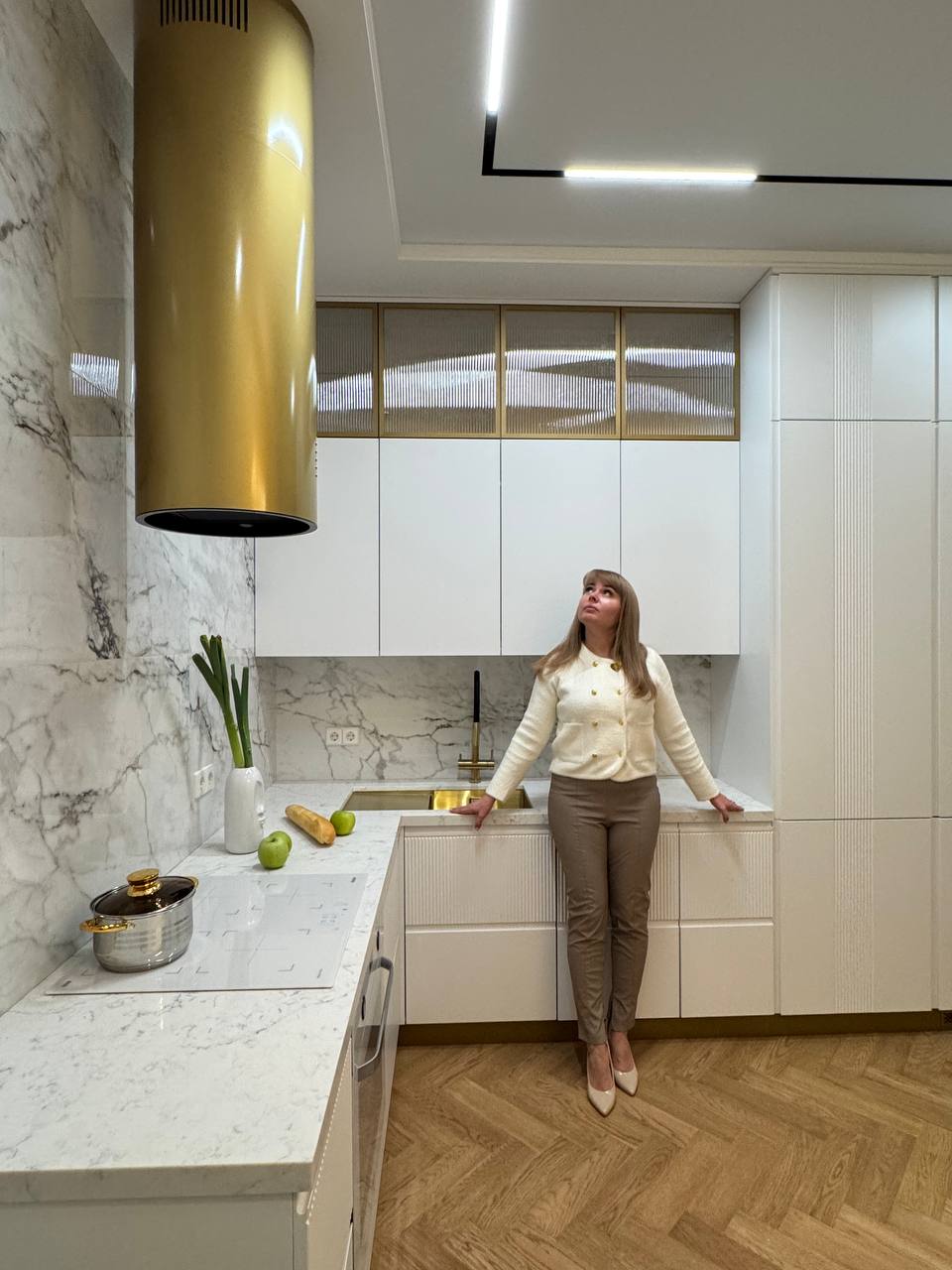 Очень люблю дизайн кварцпаркет «Дуб Карельский» — он стал базой в нескольких проектах. Также использовала штучный паркет, особенно нравится маленький формат — он даёт рандомность и глубину. Сейчас жду появления французской ёлки — это модный тренд, и хочется его где-то применить.