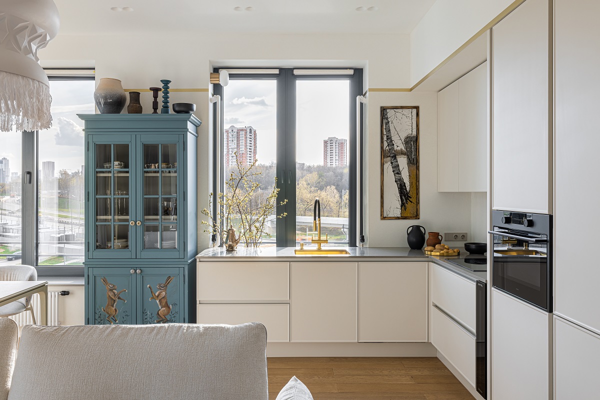Часть художественных работ, иконы, винтажный чайный сервиз из серебра сразу были ангажированы в проект из семейной коллекции. В процессе создания интерьера дизайнер подобрала еще несколько художественных работ, керамические изразцы, зеркало с домовой росписью. Большое внимание уделено предметной среде: здесь много уникальной мебели локальных российских брендов.