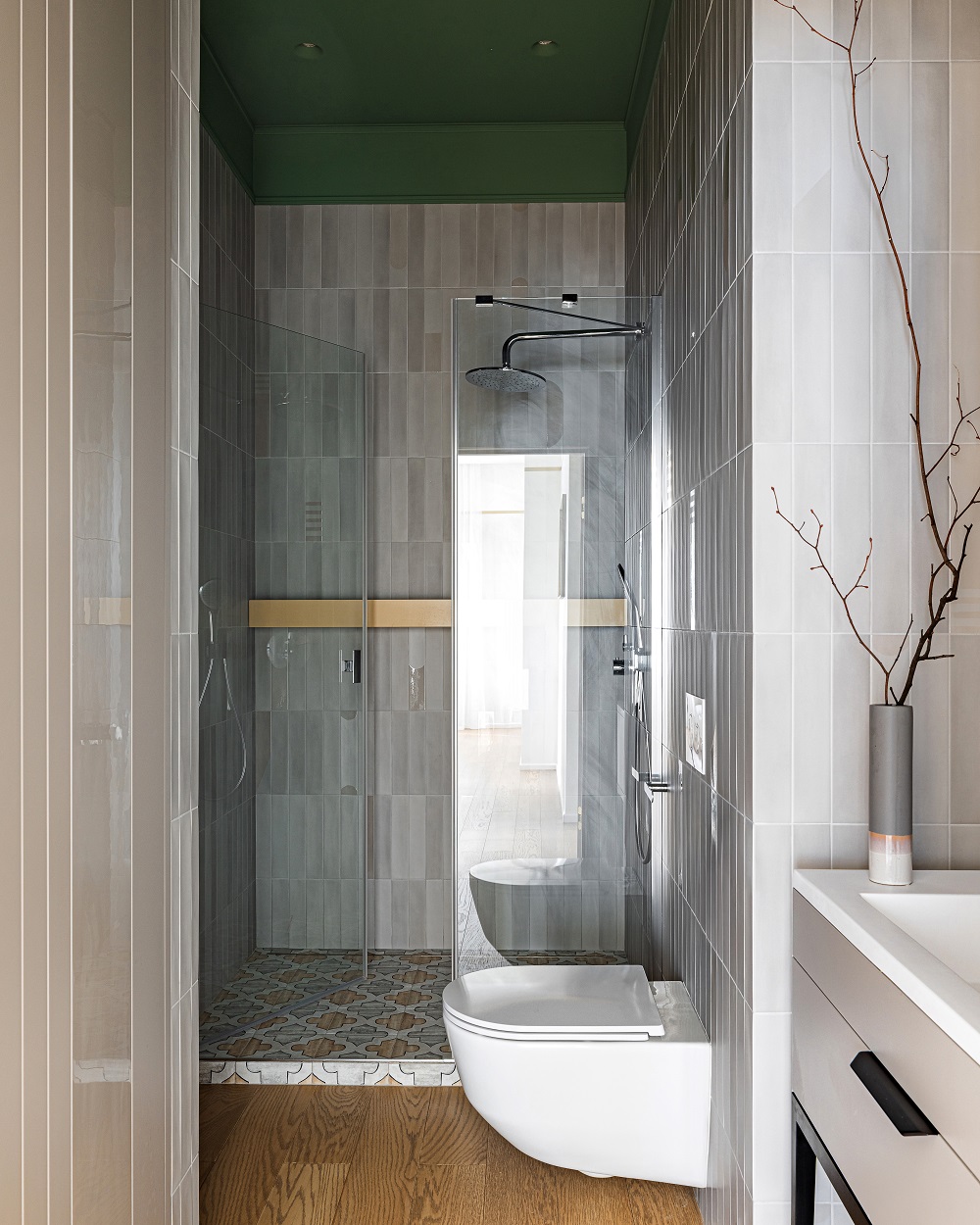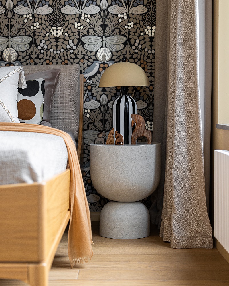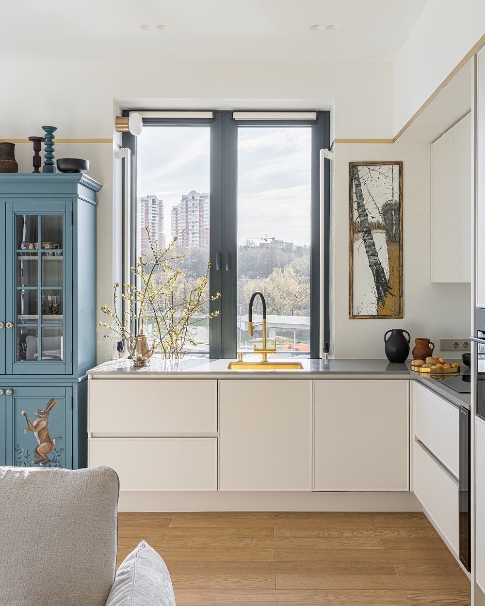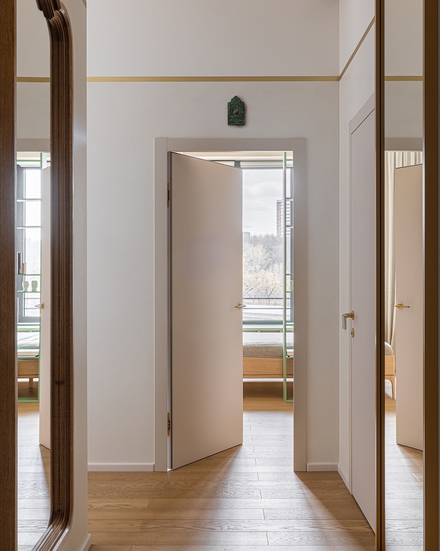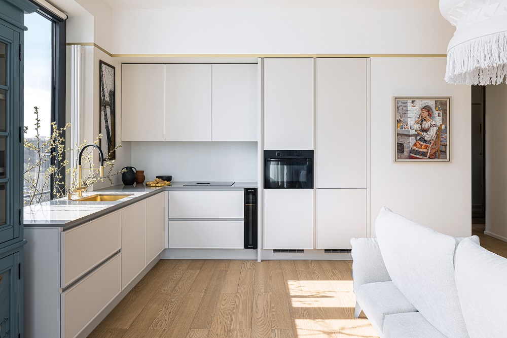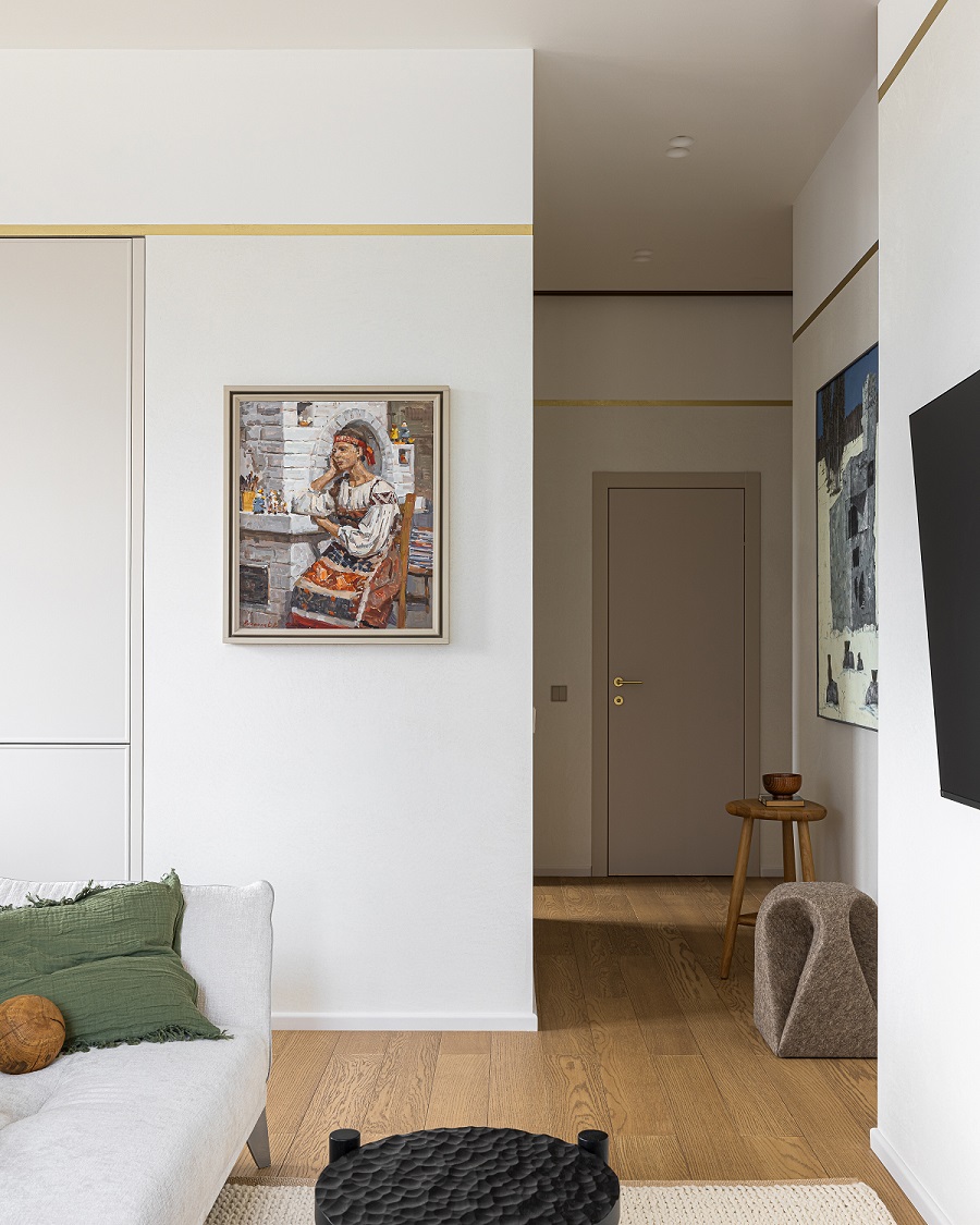 Передо дизайнером Анной Исуповой встала задача найти компромисс между архитектурой современного ЖК, ритмами большого города и привычкой заказчиков жить за городом неспешной и размеренной жизнью, их любовью к малой родине. Поэтому основа проекта стала лаконичной  и современной подстать локации и видам из окон. И в эту канву умело вплели историю о любви к природе, традициям, искусству, семейные ценности и рассказы о путешествиях.